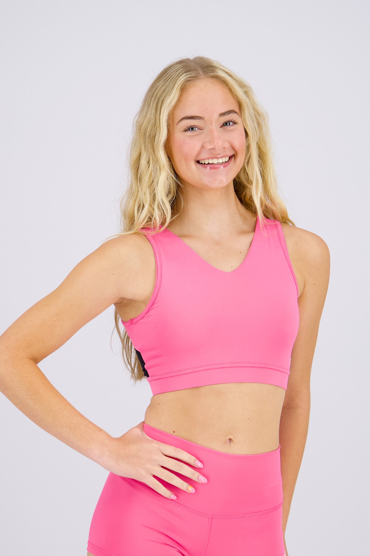 - Engineered with stretchy fabric that moves with your body, this sports bra delivers reliable support and coverage through countless stunts and routines.