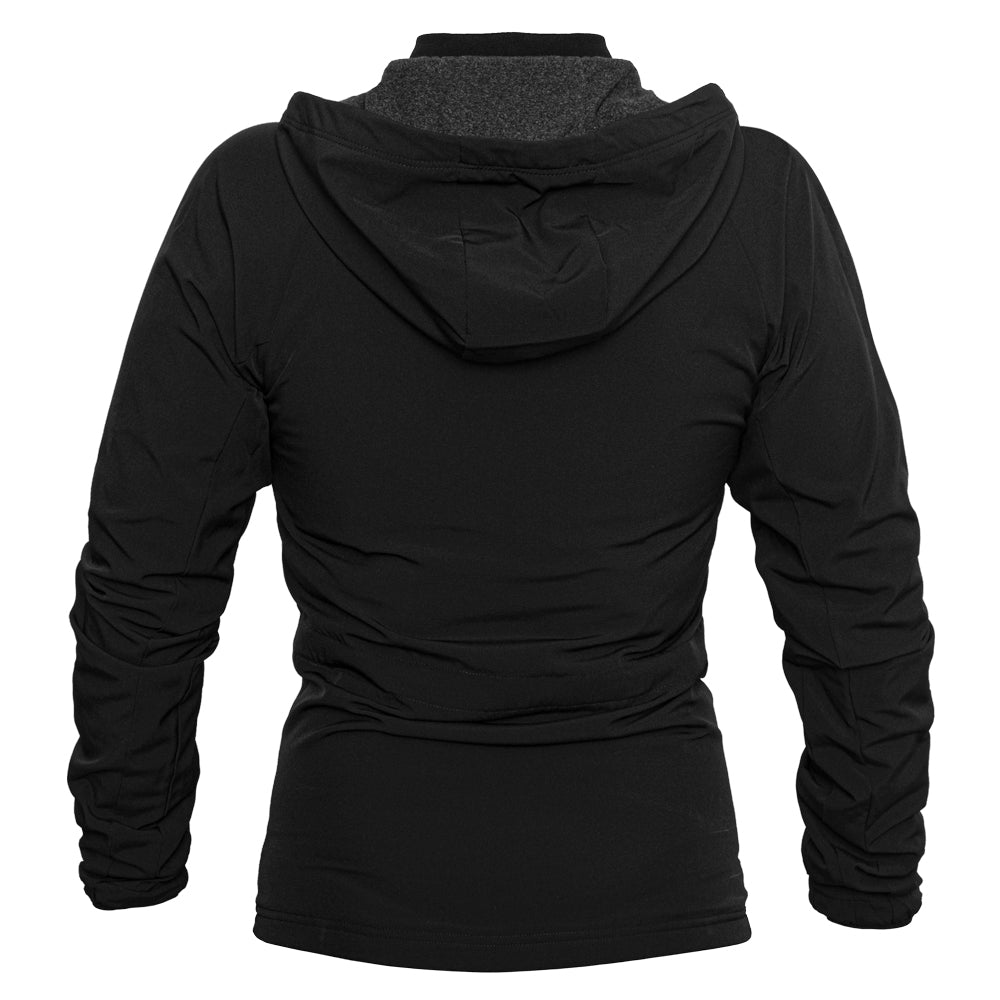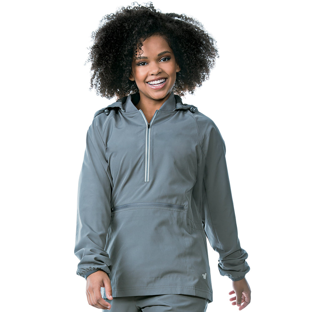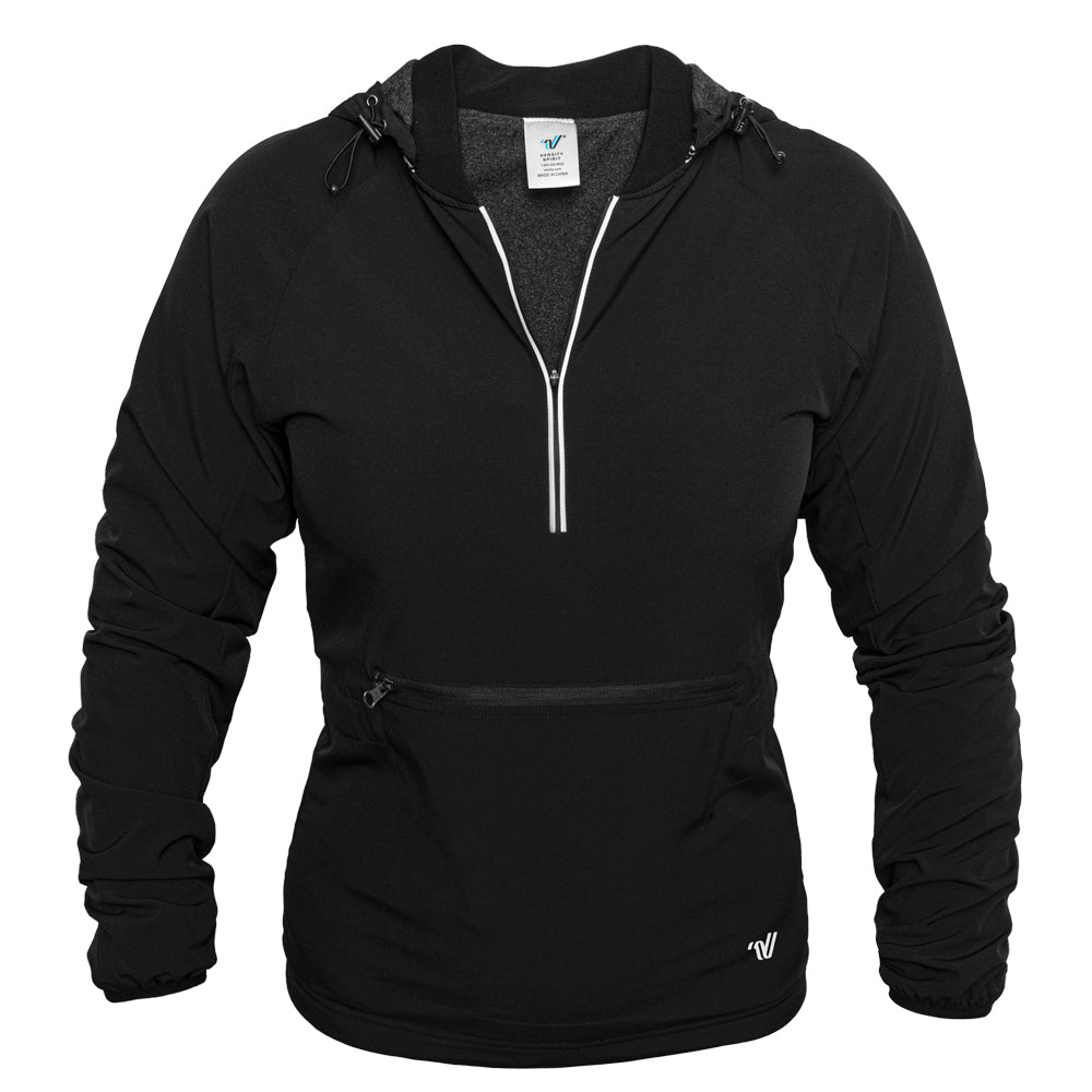 This quarter zip jacket is everything you need in a warmup! With a soft outer fabric and a removable hood, this pullover zips into a pouch for easy travel. Don't forget the matching warmup pants!