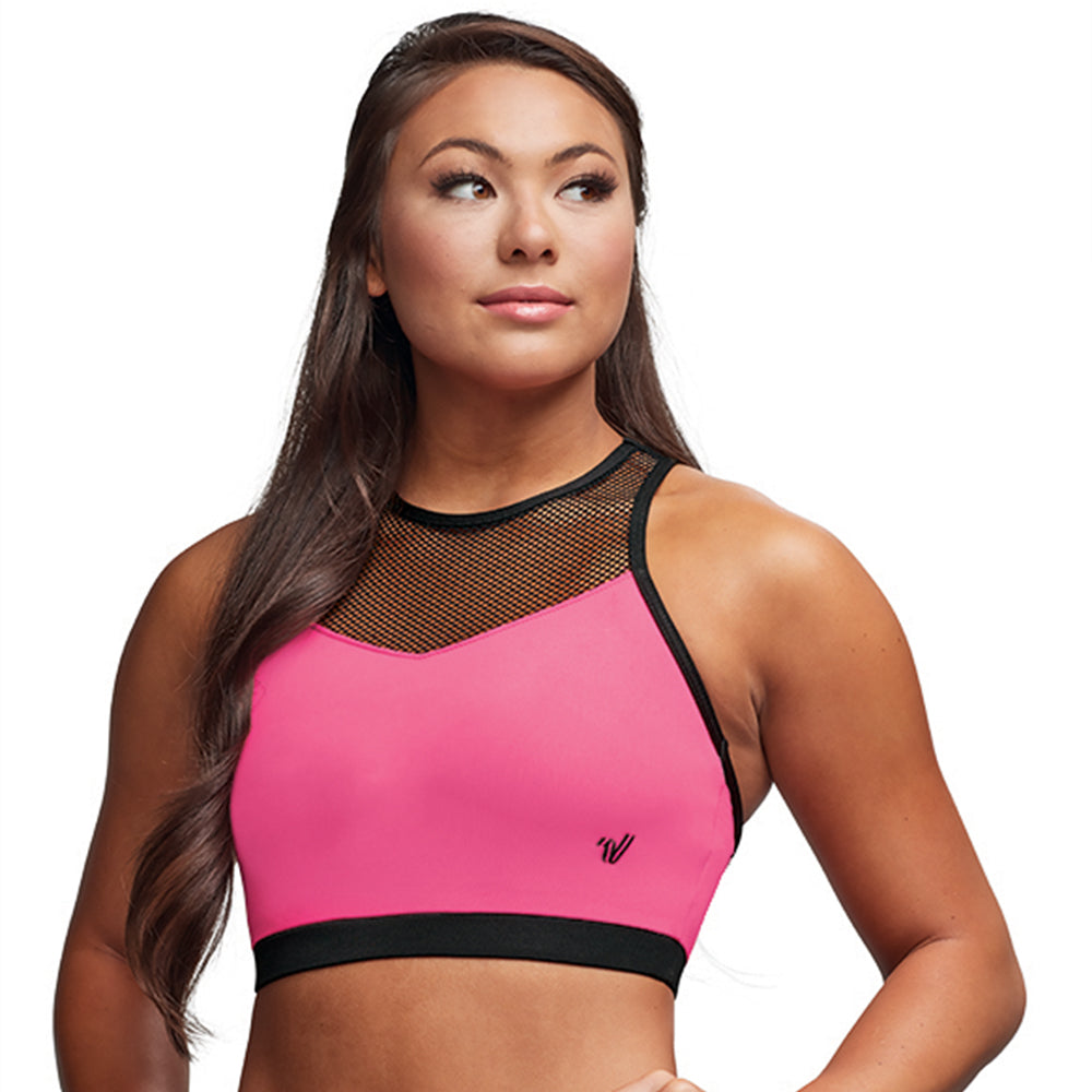 Sporty and stylish, this high round neck bra top features a keyhole back with strappy details and black active mesh front and back panels for an athletic finish. Choose from neon pink taffy with black foil active mesh and black MotionFLEX® trim or black with black foil active mesh and black MotionFLEX® trim. Lined front; Available in youth sizes 2XS-XL and adult XS-2XL.